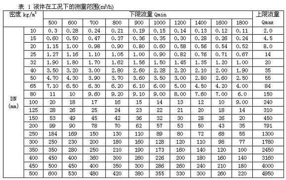 正常测量流量范围液体、气体流量测量范围见表2;蒸气流量范围见表3