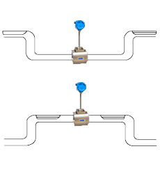 无论测量何种流体,传感器可以在水平管道上侧装。特别是测量过热蒸汽,饱和蒸汽和低温液体,若条件允许最好采用侧装,这样流体的温度对放大器的影响较小。